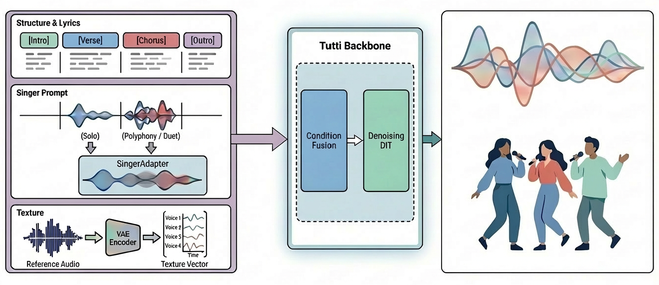 Abstract. While existing Singing Voice Synthesis systems achieve high-fidelity solo performances, they are constrained by global timbre control, failing to address dynamic multi-singer arrangement and vocal texture within a single song. To address this, we propose Tutti, a unified framework designed for structured multi-singer generation. Specifically, we introduce a Structure-Aware Singer Prompt to enable flexible singer scheduling evolving with musical structure, and propose Complementary Texture Learning via Condition-Guided VAE to capture implicit acoustic textures (e.g., spatial reverberation and spectral fusion) that are complementary to explicit controls. Experiments demonstrate that Tutti excels in precise multi-singer scheduling and significantly enhances the acoustic realism of choral generation, offering a novel paradigm for complex multi-singer arrangement.